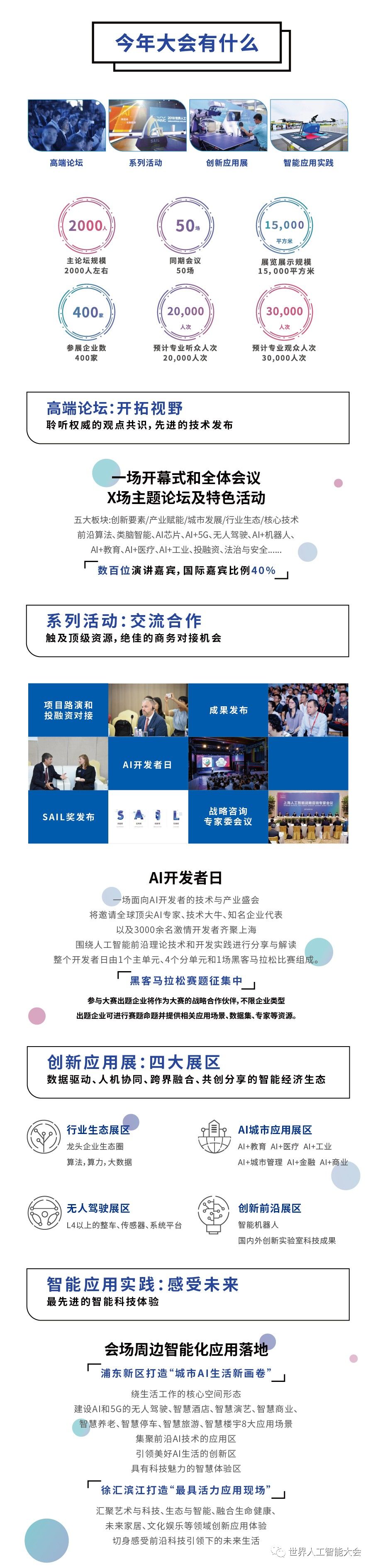 与去年相比,今年大会将继续坚持“高端化、国际化、专业化、市场化”,并突出“智能化”的办会方针,对标国际顶级行业盛会,进一步提升国际化和专业化水平,积极探索大会的智能化组织和市场化运营,持续打造世界顶尖的人工智能合作交流平台。大会设置“高端论坛、主题活动、应用展示、智能体验”四大板块,进一步凸显以下特点: